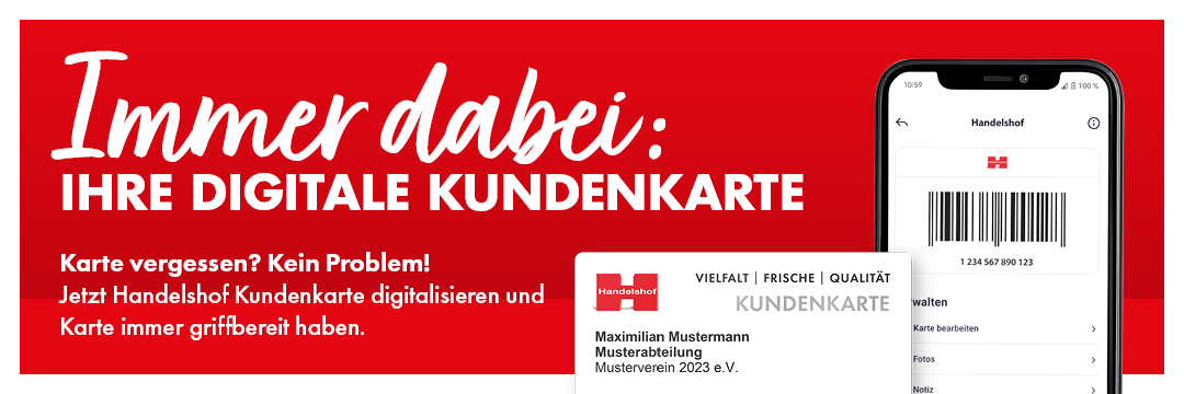 Lästiges Durchwühlen der Portemonnaiefächer nach einer Plastikkarte? Sparen Sie sich den Stress! Sie können Ihre Handelshof Kundenkarte auch digitalisieren, sodass Sie Ihre Karte immer griffbereit haben – direkt auf Ihrem Smartphone oder Tablet. So sparen Sie Zeit beim Einkauf.