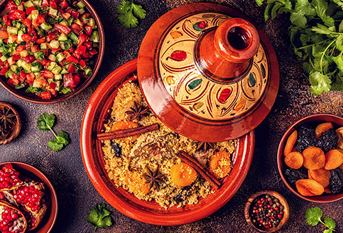 Couscous, Tajine und Pastilla – diese drei Gerichte bilden die Grundlagen der marokkanischen Küche. Ihr Ursprung ist jedoch unterschiedlich. Couscous – in Marokko immer in Kombination mit Gemüse oder Fleisch serviert – stammt wie die Tajine von den Berbern. Unter einer Tajine wird ein Tontopf mit spitz zulaufendem Deckel verstanden, der für die Zubereitung von verschiedenen Speisen über einem Holzkohle-Feuer platziert wird.