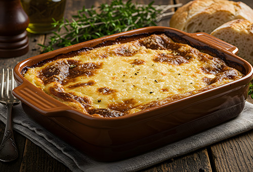 Die Moussaka bei 180 °C Umluft (200 °C Ober-/Unterhitze) im vorgeheizten Backofen 30–40 Minuten backen, bis die Oberfläche goldbraun und die Béchamelsoße leicht fest geworden ist. Vor dem Anschneiden einige Minuten ruhen lassen.